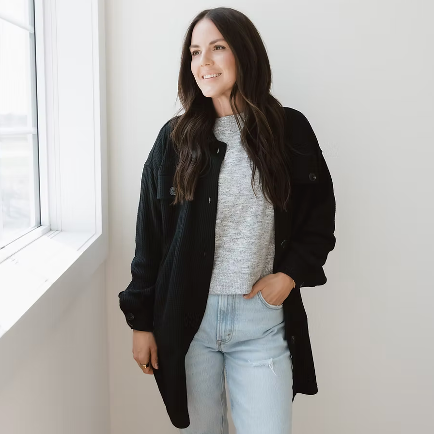 Time to elevate your wardrobe with this MAMA Waffle Knit Shacket.