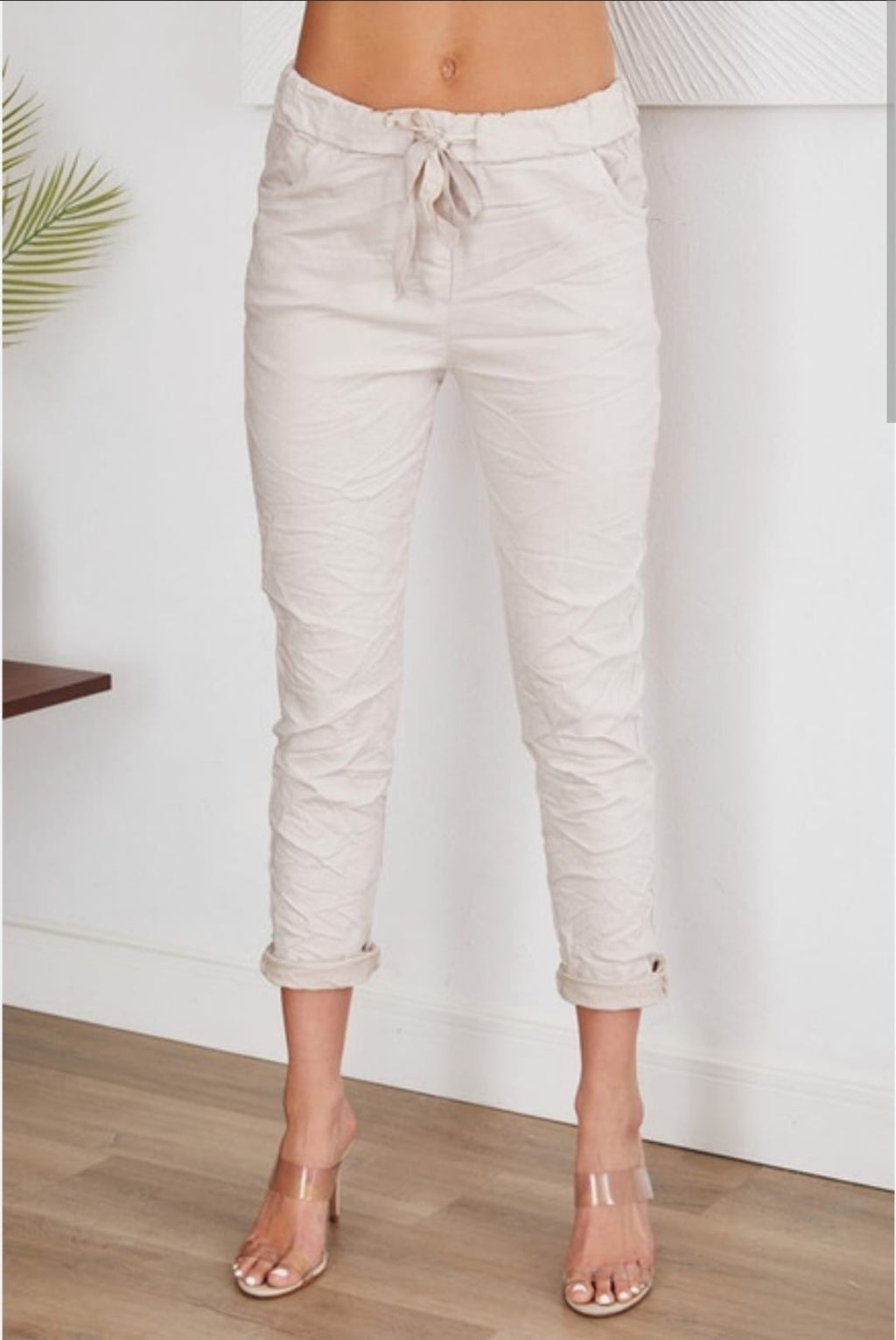 Please note, these pants are sold with a "crinkle" effect that will straighten out after washing. To keep a slight crinkle effect after washing, ball up the joggers while wet and create a distressed look with your hands. Then lay flat to dry.