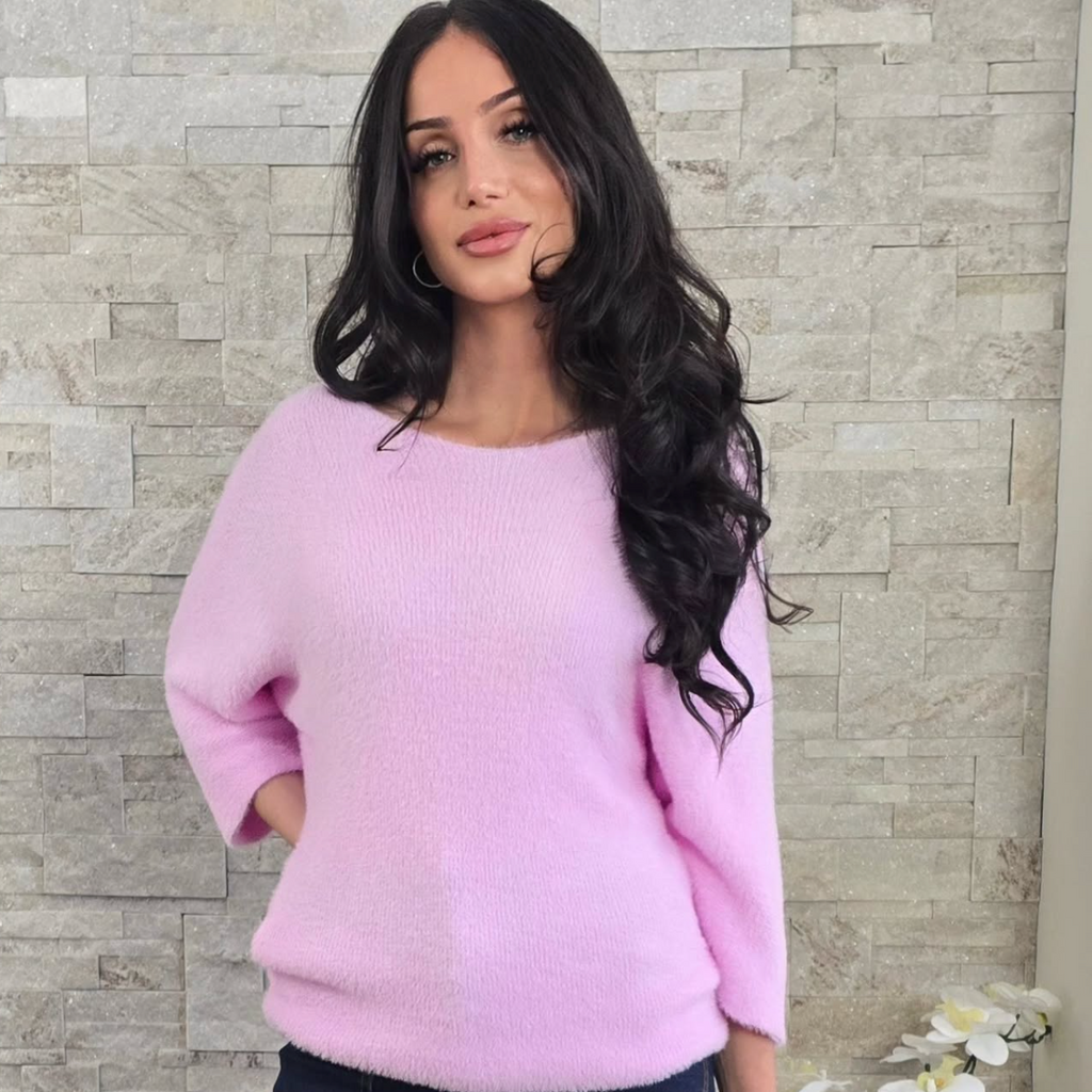 Fuzzy Italian Knit Sweater with fitted bottom and 3/4 length sleeve.