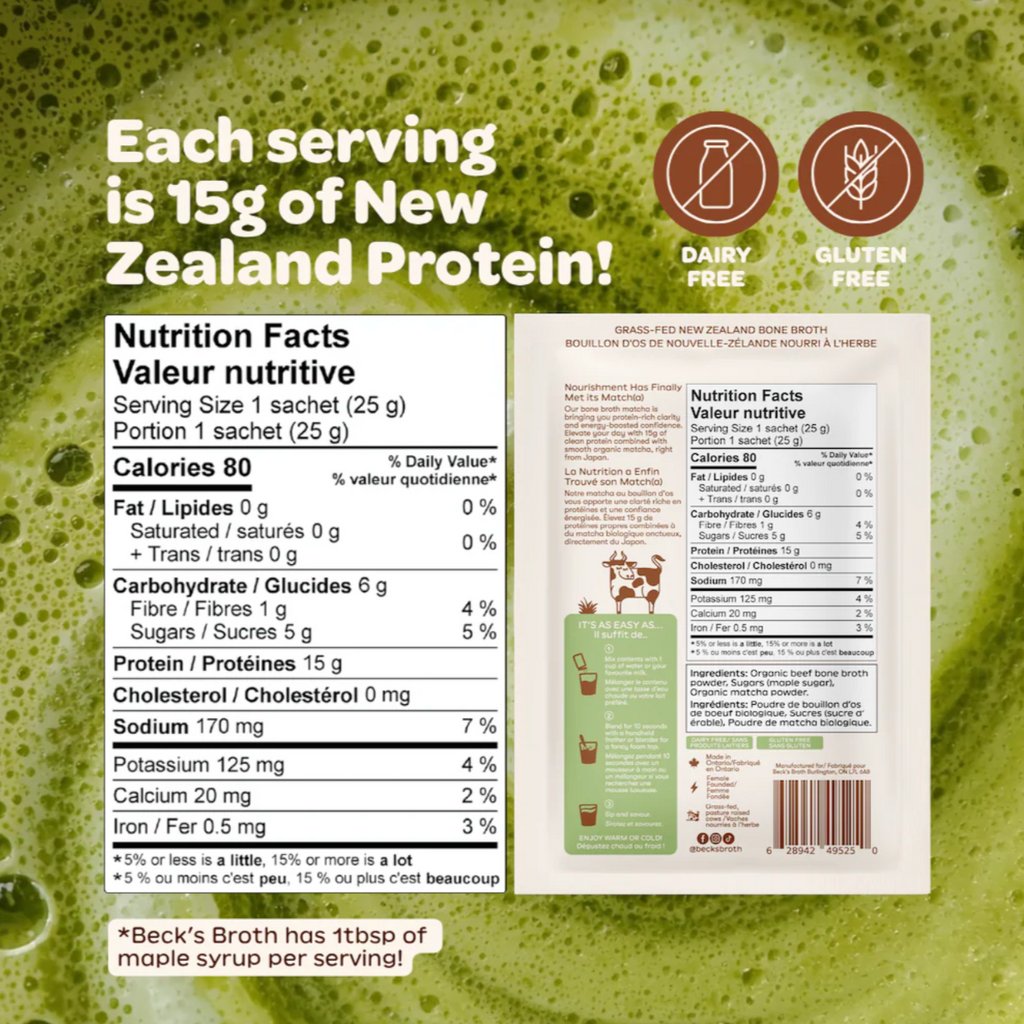 Beef bone broth powder, Maple sugar, Organic matcha powder.