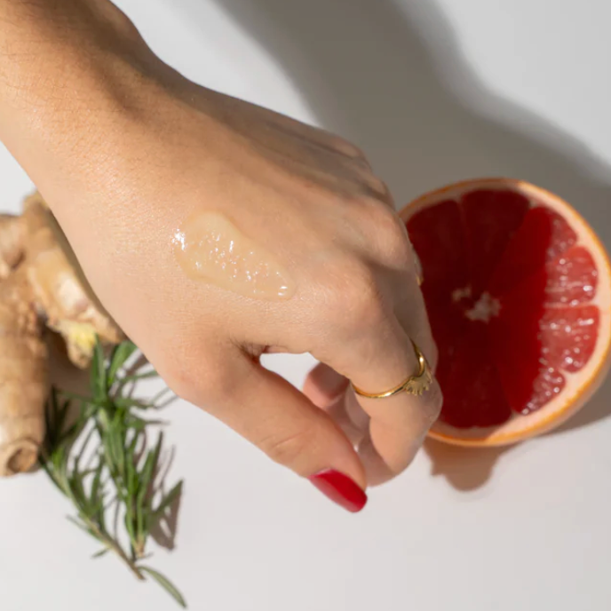 Ingredients: Jojoba (Simmondsia chinensis) oil, Evening Primrose (Oenothera biennis) oil, Sunflower (Helianthus annuus) oil, Hempseed (Cannabis sativa) oil, Hydrolized Hyaluronic acid, plant emulsifying wax, water (Aqua), Apricot Kernel (Prunus Armeniaca) oil, Sweet Almond (Prunus Amygdalus Dulcis) oil, White Grapefruit (Citrus grandis) oil, Ylang Ylang (Cananga odorata) oil, Rosemary (Rosmarinus Officinalis) oil and Ginger (Zingiber officinale) oil.