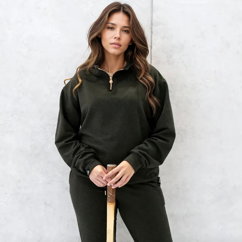 The sleek 1/4 length zipper, adorned with Olive & Splash's signature charm, adds a refined touch while offering versatile styling — wear it zipped up for a cozy feel or slightly open for a laid-back vibe. The neutral hues makes it a wardrobe essential, perfect for layering or wearing solo.
