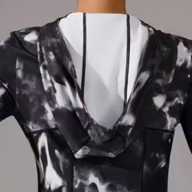 This black-and-white marble hooded top delivers a sleek, contoured fit with long sleeves and strategic seam lines that enhance shape.