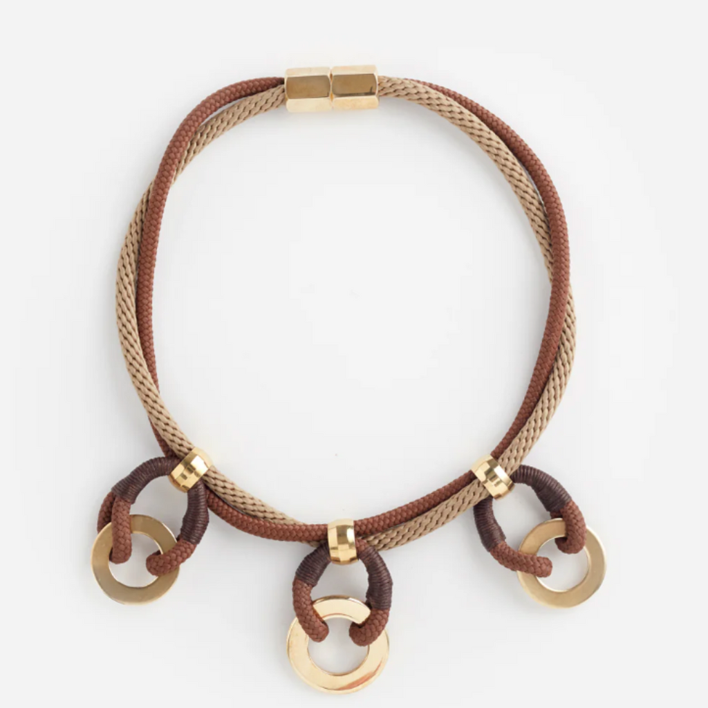 Braided rope linked with brass and rope combinations and closed with a magnetic brass clasp.
