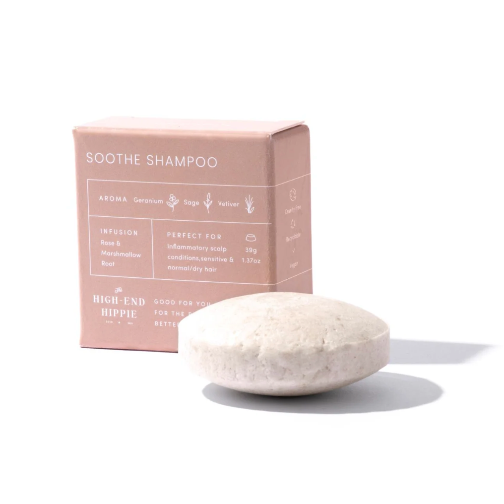 Experiencing a dry, itchy-feeling scalp? The High-End Hippie's Soothe Shampoo Bar is crafted with a gentle formula designed to help comfort and rebalance both scalp and hair.