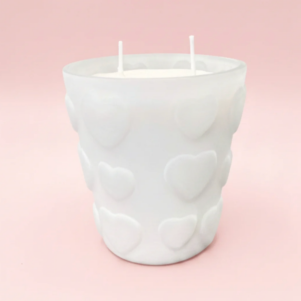 Featuring two wicks for an even and consistent burn, the frosted heart shaped vessel glows beautifully when lit, adding a romantic touch to any room. Once finished, the keepsake glass can be reused as a decorative accent, making it a candle you’ll love long after the last burn.