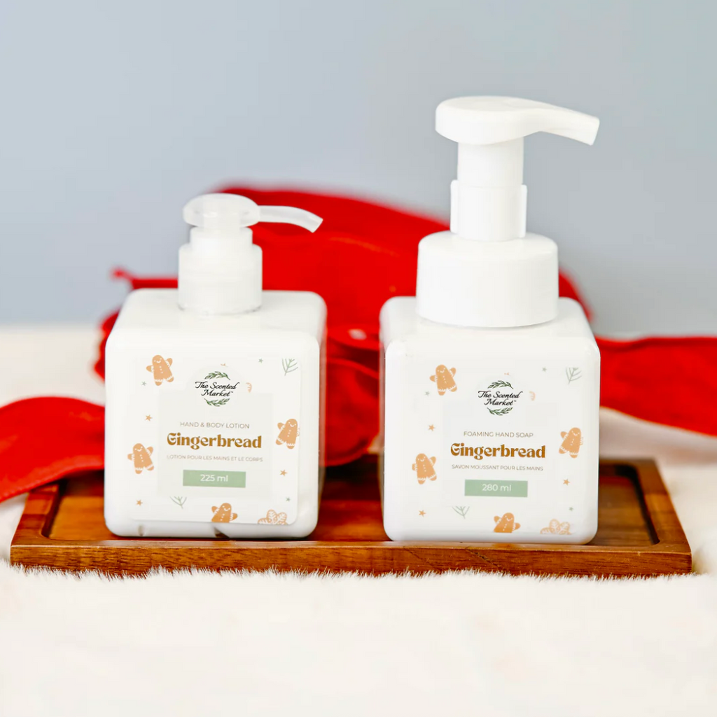 Indulge in the warm, comforting scent of freshly baked gingerbread with our Gingerbread Foaming Hand Soap & Body Lotion Gift Set.