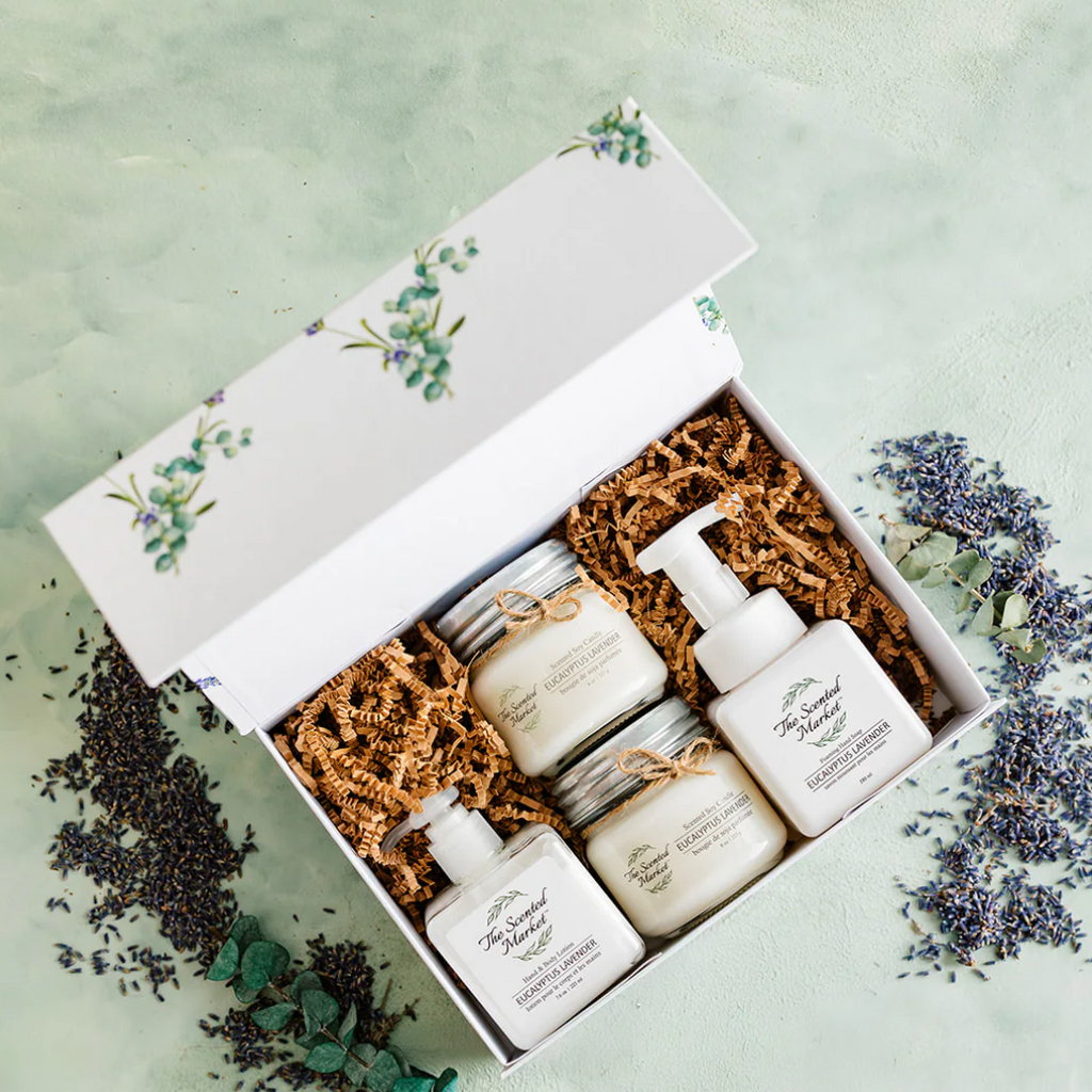 Each box includes two 8oz scented soy candles, a 280ml foaming hand soap, and a 225ml hand & body lotion—all crafted with high-quality, eco-friendly ingredients.